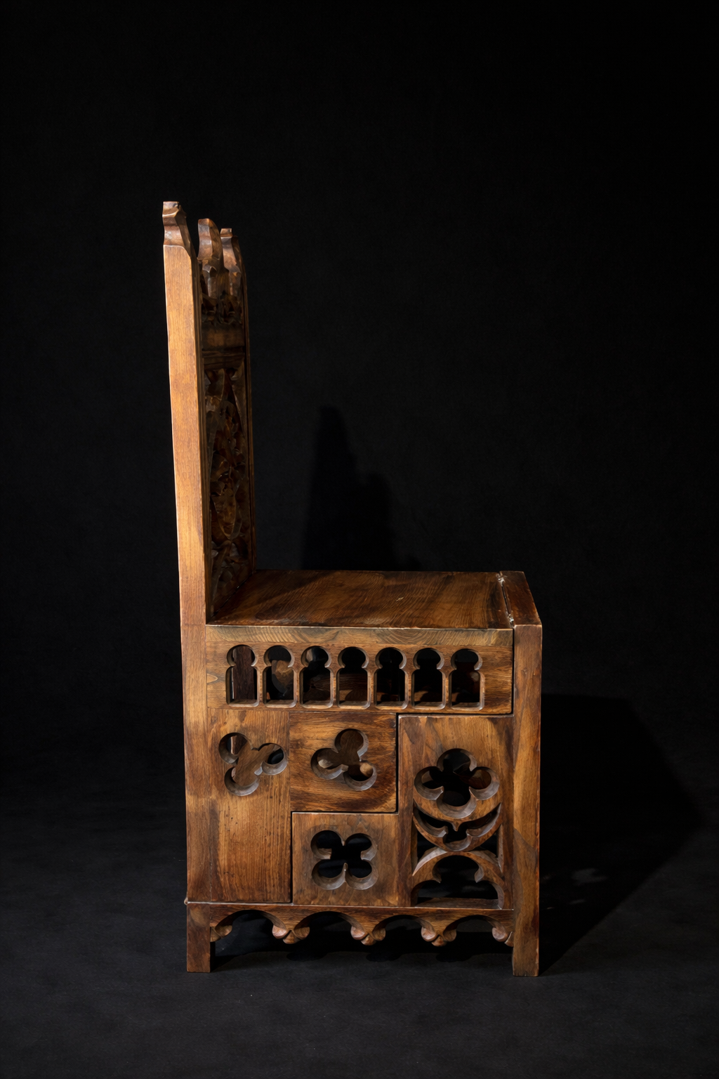 Ce fauteuil médiéval a été conçu à la demande d’une cliente avec une particularité fonctionnelle : se transformer en escabeau 6 marches, alliant esthétique et usage.