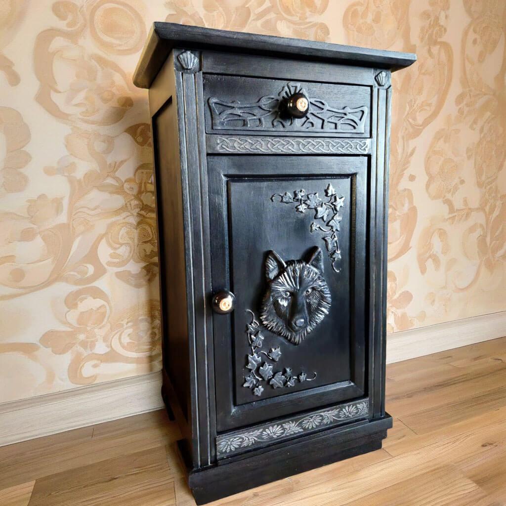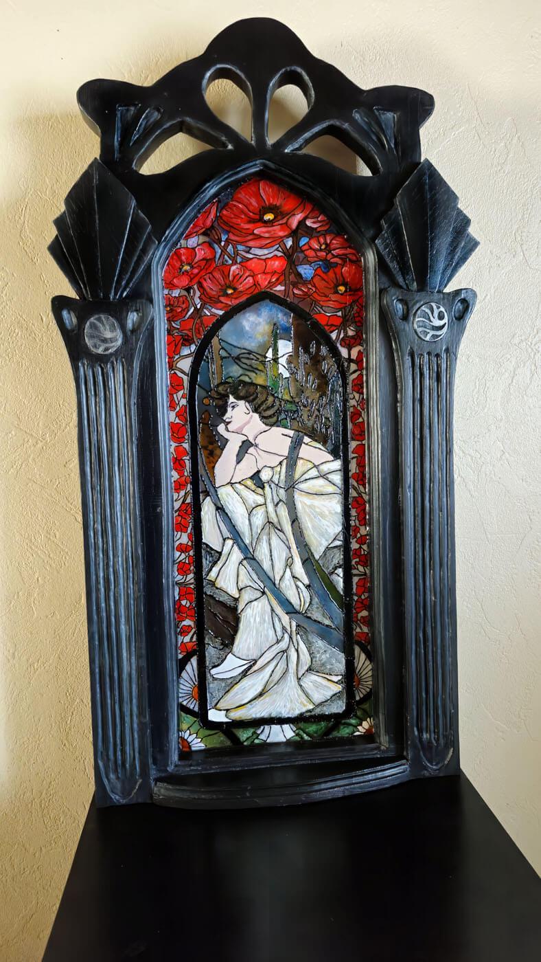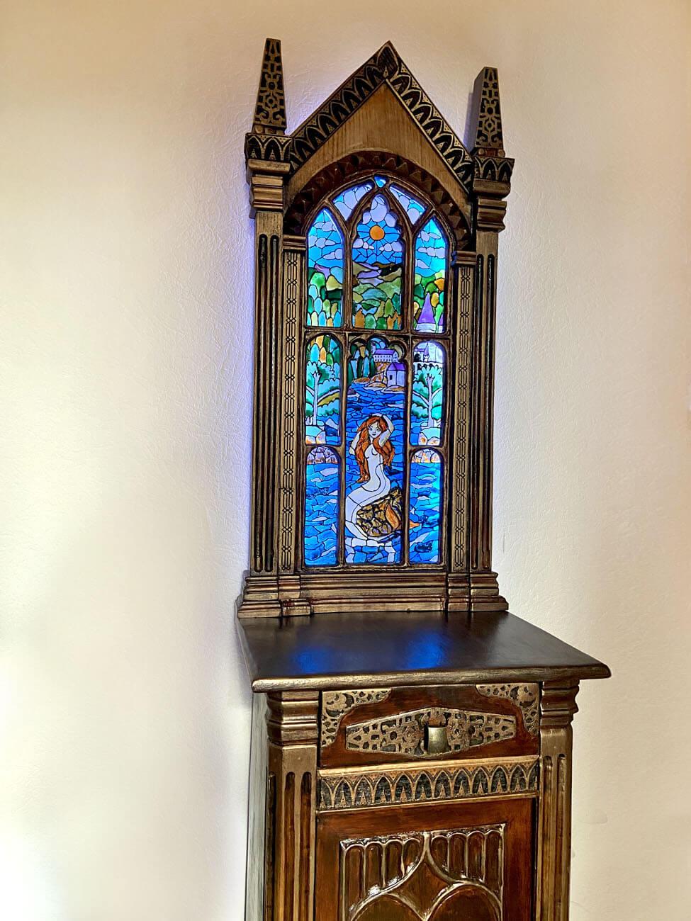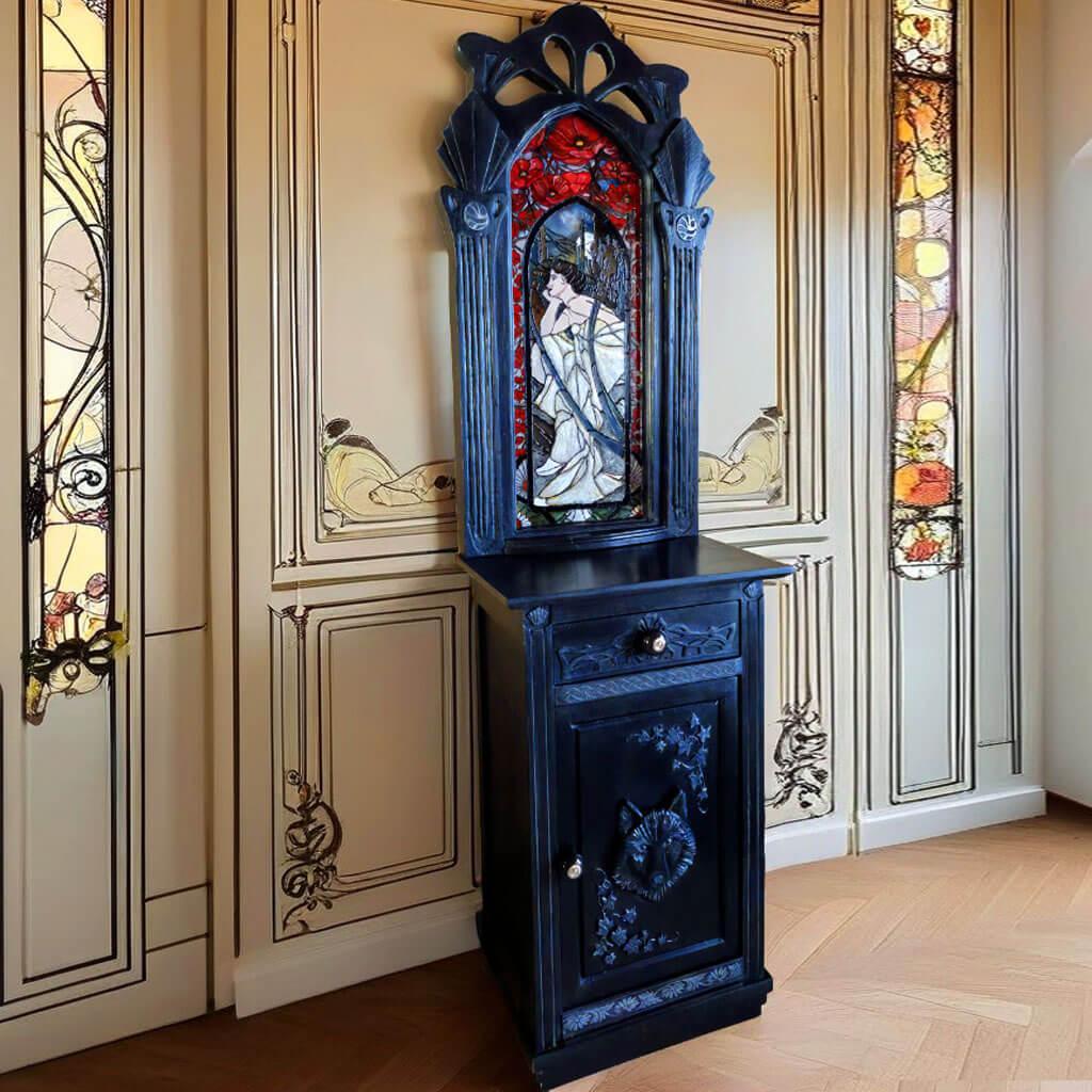 Le meuble évolue vers un style plus artistique et décoratif. Sur cette création : le vitrail peint à la main adopte des lignes plus organiques, une sculpture de tête de loup vient structurer la façade, des ornements végétaux habillent l’ensemble.