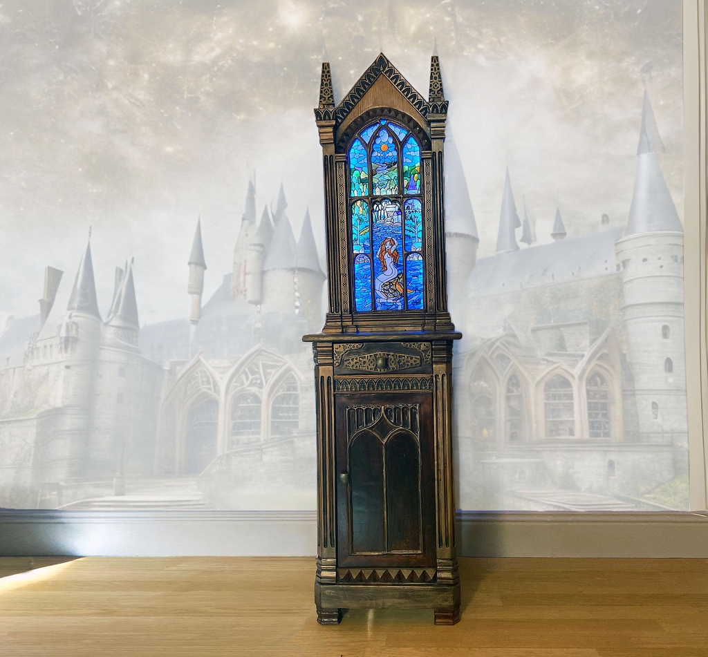 Ce meuble ( pièce unique ) est né d’une envie : faire émerger une pièce capable d’évoquer l'univers merveilleux de la plus incroyable école de magie, ses matières nobles et ses jeux de lumière… sans jamais en faire une reproduction directe. Ici on retrouve un réinterprétation du vitrail de la sirène incrusté dans un decor fidèle au miroir du Rised. Le but etait ici de permettre a un collectionneur de mettre en scene l'oeuf d'or remis a Harry lors du tournois des 3 sorciers.
